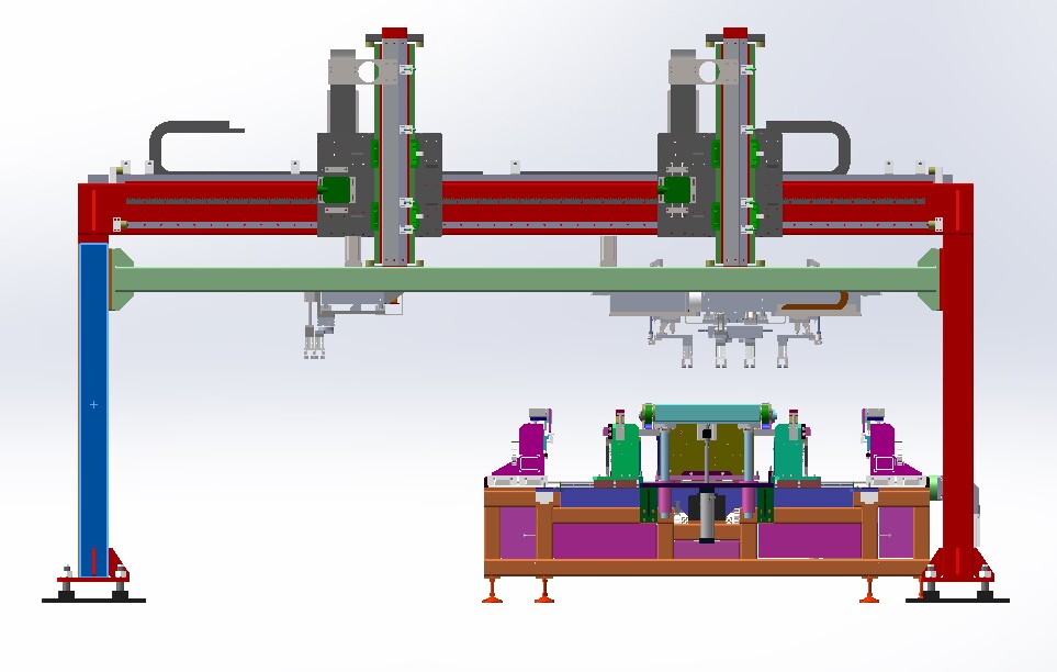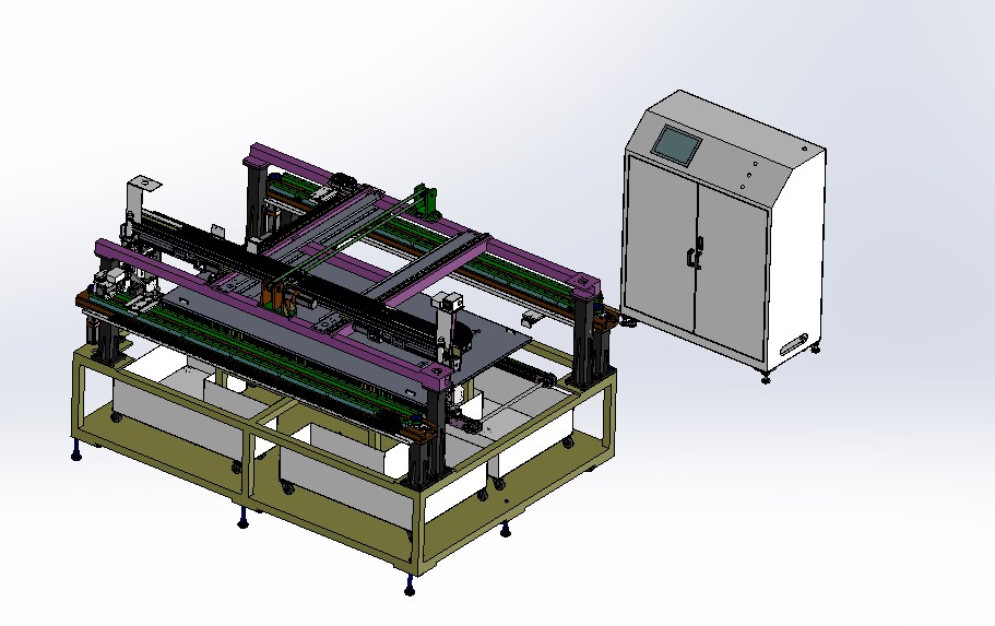 自動排版機(jī)的主要功能單元有:玻璃輸送定位系統(tǒng)、抓取行走系統(tǒng)、視覺檢測系統(tǒng)、電控系統(tǒng)等;通過以上功能單元,實(shí)現(xiàn)了將自動串焊機(jī)串焊好的電池串,按照工藝尺寸要求和排版方向順序自動排版鋪設(shè)到玻璃(EVA已經(jīng)鋪設(shè))上,組成電池串陣列。玻璃/EVA通過傳輸線傳輸至指定位置,機(jī)械手抓取電池串實(shí)現(xiàn)CCD定位、自動旋轉(zhuǎn)、自動排版功能。設(shè)備通過同步帶傳輸與自動生產(chǎn)線對接,實(shí)現(xiàn)了自動流水作業(yè)。